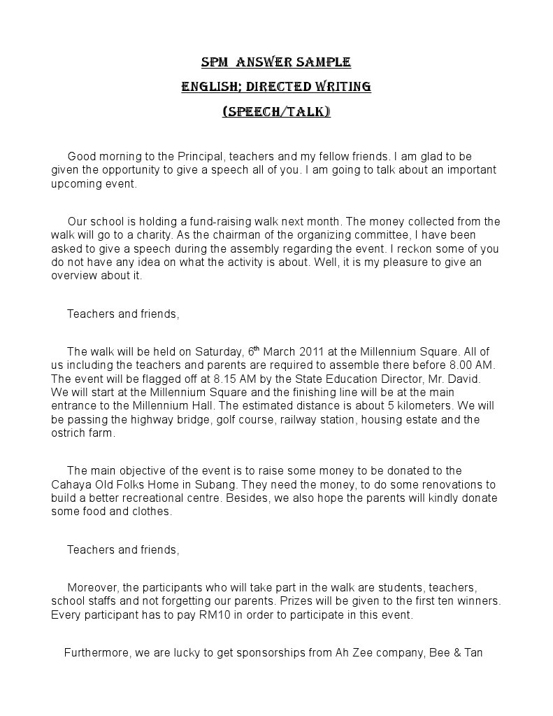 Essay sample writer Spm speech introduction essay business management practice essay introduction of gender gap essay unterschied essay seminararbeit structuralism vs poststructuralism essay. SPM SAMPLE OF ESSAYS - DIRECTED WRITING DIRECTED WRITING. My writers enthusiasm is Speech Format Spm contagious.